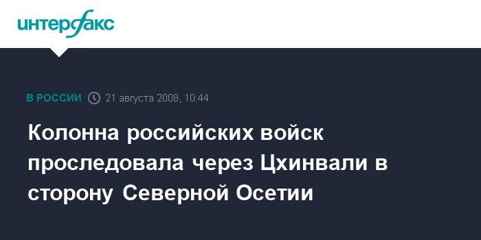 Как передал корреспондент "Интерфакса", большая российская военная колонна, шедшая со стороны административной границы с Грузией, около 9:00 МСК вышла на восточную окраину Цхинвали.