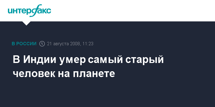 Москва. 21 августа. INTERFAX.RU – Самый старый человек в мире скончался в Индии в возрасте 138 лет, сообщает в среду британская газета "Дейли мэйл".