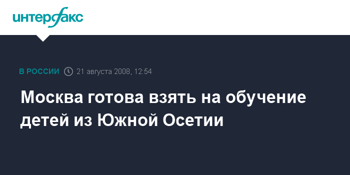 Москва. 21 августа. INTERFAX.RU - Москва готова принять на обучение детей из Южной Осетии, а также оказать помощь осетинским школам, пострадавшим от войны, сообщила руководитель департамента образования столицы Ольга Ларионова.