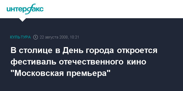 Москва. 22 августа. INTERFAX.RU - Шестой Московский фестиваль отечественного кино "Московская премьера" пройдет в столице с 6 по 15 сентября, сообщили "Интерфаксу" в администрации города в пятницу. Там подчеркнули, что церемония открытия состоится 6 сентября на Триумфальной площади во время празднования Дня города.