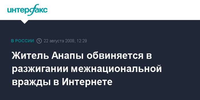 Москва. 22 августа. INTERFAX.RU - Жителю города-курорта Анапа Краснодарского края предъявлено обвинение в рамках уголовного дела, возбужденного по факту размещения на интернет-форуме сообщений националистического характера. "Обвинение предъявлено по ч.1 ст. 282 УК РФ (возбуждение ненависти или вражды, а равно унижение человеческого достоинства), - сообщил агентству "Интерфакс-Юг" в пятницу представитель следственного отдела по Анапе СУ СКП РФ по краю. Он отметил, что расследование дела находится на завершающей стадии, возможно, оно будет передано в суд в начале сентября.