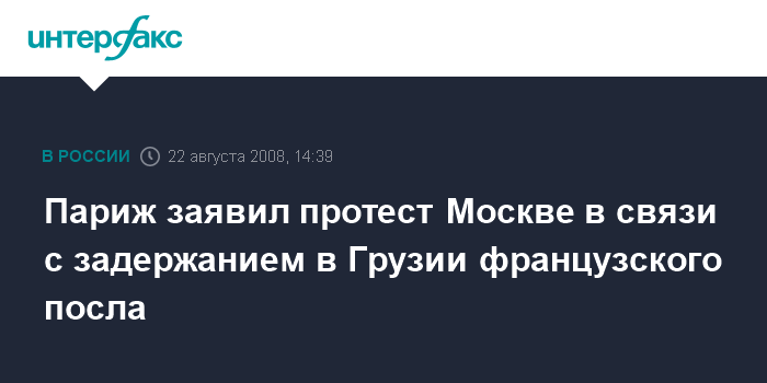 Москва. 22 августа. INTERFAX.RU - Франция выразила России протест по поводу задержания российскими военными французского посла в Грузии. Как говорится в сообщении французского МИД, распространенном в пятницу, военные три часа удерживали посла Эрика Фурнье на КПП в окрестностях Гори.