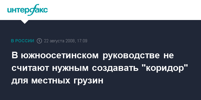 Москва. 22 августа. INTERFAX.RU - Президент Южной Осетии Эдуард Кокойты не видит необходимости в создании на территории Южной Осетии "коридора" для грузинских беженцев, сообщает сайт правительства непризнанной республики. "Никакие "коридоры" организовывать не надо. Пусть живут себе спокойно. Это наши граждане", - ответил Кокойты на вопрос Верховного комиссара ООН по делам беженцев Антонио Гутерриша о возможности создания так называемого "свободного прохода" для граждан грузинской национальности, проживающих на территории Южной Осетии.