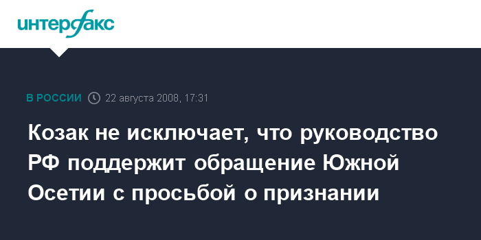 Отвечая в пятницу на вопрос, какой может быть реакция российского руководства на обращение граждан Южной Осетии признать ее самостоятельность, Козак ответил кратко: "Скорее, поддержка".
