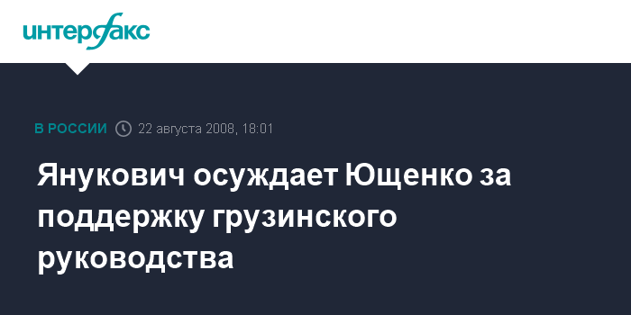 Киев. 22 августа. INTERFAX.RU - Лидер украинской оппозиционной Партии регионов Виктор Янукович считает, что президент Виктор Ющенко не должен был выражать поддержку действиям президента Грузии Михаила Саакашвили от имени государства.