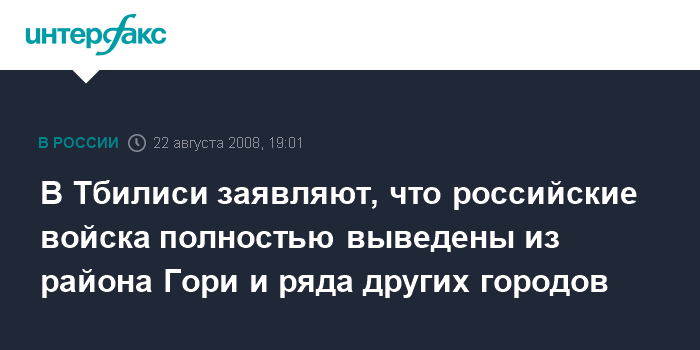 Тбилиси. 22 августа. INTERFAX.RU - Секретарь Совета национальной безопасности Грузии Каха Ломая сообщил сегодня вечером журналистам, что подразделения российских войск полностью отведены из окрестностей Гори, а также из городов Хашури, Каспи и Зугдиди.