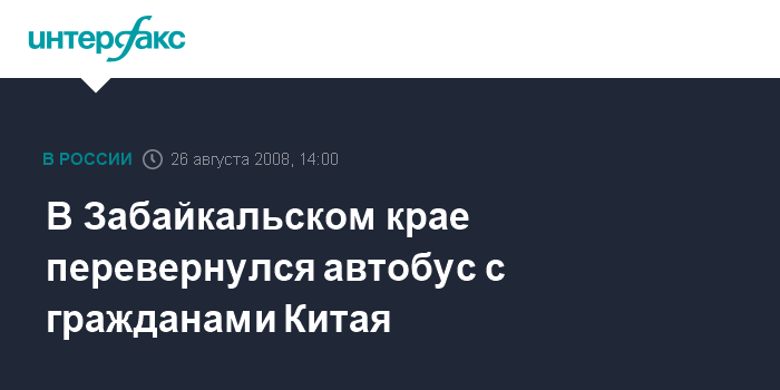 Москва. 26 августа. INTERFAX.RU - На автомобильной трассе Чита-Ясногорск Забайкальского края опрокинулся автобус с китайского производства с гражданами КНР. "Есть пострадавшие. С места ДТП доставлено 9 человек в военный госпиталь гарнизона Ясная и 9 человек в Оловяннинскую районную больницу п. Ясногорск для медицинского осмотра", - сообщил агентству "Интерфакс-Сибирь" оперативный дежурный МЧС по Читинской области.