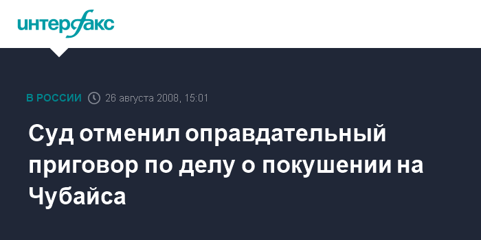 Москва. 26 августа. INTERFAX.RU - Верховный суд РФ отменил оправдательный приговор по делу о покушении на бывшего главу РАО ЕЭС Анатолия Чубайса.