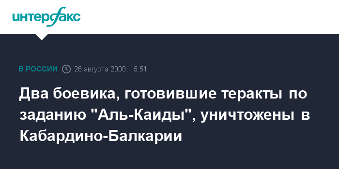 Москва. 26 августа. INTERFAX.RU - ФСБ России сообщает о нейтрализации на территории Кабардино-Балкарии двух боевиков, которые по заданию эмиссаров международной террористической организации "Аль-Каида" готовили серию диверсионных террористических актов в ряде регионов Северного Кавказа.