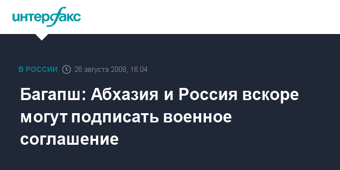 Москва. 26 августа. INTERFAX.RU - В ближайшее время может быть подписано военное соглашение между Россией и Абхазией, заявил президент Абхазии Сергей Багапш.