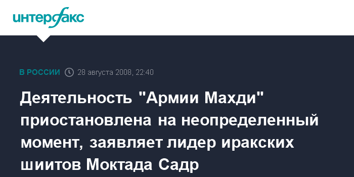 Тегеран. 28 августа. ИНТЕРФАКС - Лидер иракских шиитов Моктада Садр приостановил на неопределенное время деятельность возглавляемой им "Армии Махди", сообщает в четверг иранский англоязычный телеканал "Пресс-ТВ", который цитирует заявление, распространенное этой группировкой.