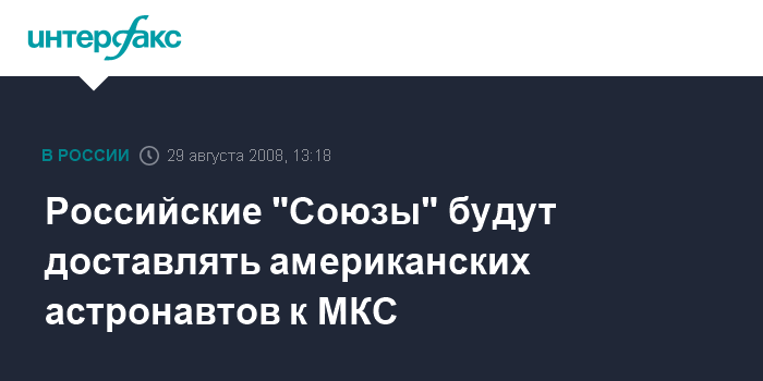 Москва. 29 августа. INTERFAX.RU - Россия будет "возить" американских астронавтов в космос после прекращения полетов шаттлов, заявил "Интерфаксу" в пятницу заместитель руководителя Роскосмоса Виктор Ремишевский. "Практически уже принято решение, что после прекращения эксплуатации шаттлов некоторое время американские астронавты будут доставляться на Международную космическую станцию на наших "Союзах". Мы об этом с НАСА договорились", - сказал Ремишевский, добавив, что "никто не будет бросать станцию, если по каким-либо причинам одно из государств не будет ее посещать".