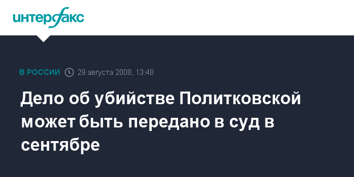 Москва. 29 августа. INTERFAX.RU - Дело об убийстве обозревателя "Новой газеты" Анны Политковской будет передано в суд, возможно, уже в первой декаде сентября, сообщил замглавного редактора издания Сергей Соколов. "Ориентировочно на следующей неделе, насколько я понимаю, обвинительное заключение должно уйти в прокуратуру на визирование. И где-то в первой декаде сентября дело должно быть направлено с суд", - сказалообщил Соколов "Интерфаксу".