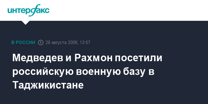 Москва. 29 августа. INTERFAX.RU - Президенты России и Таджикистана Дмитрий Медведев и Эмомали Рахмон посетили в пятницу 201-ю российскую военную базу, которая находится на территории республики.