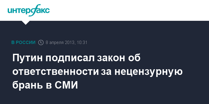 Москва. 8 апреля. INTERFAX.RU - Президент России Владимир Путин подписал закон, которым вводится ответственность за нецензурную брань в СМИ, сообщает сайт Кремля.