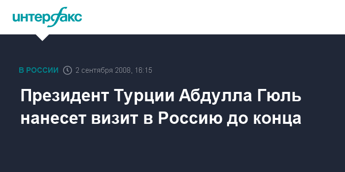 Стамбул. 2 сентября. INTERFAX.RU - Глава МИД РФ Сергей Лавров сообщил, что президент Турции Абдулла Гюль приедет с визитом в Россию до конца 2008 года. Такое заявление он сделал сегодня в Стамбуле после переговоров с турецким коллегой Али Бабаджаном.