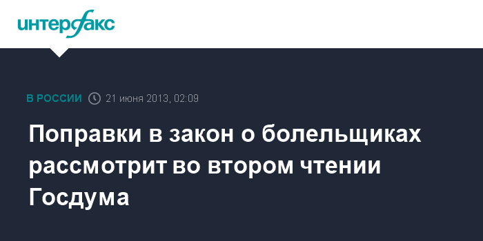Москва. 21 июня. ИНТЕРФАКС - Госдума РФ в пятницу рассмотрит во втором чтении законопроект о внесении изменений в закон о болельщиках.