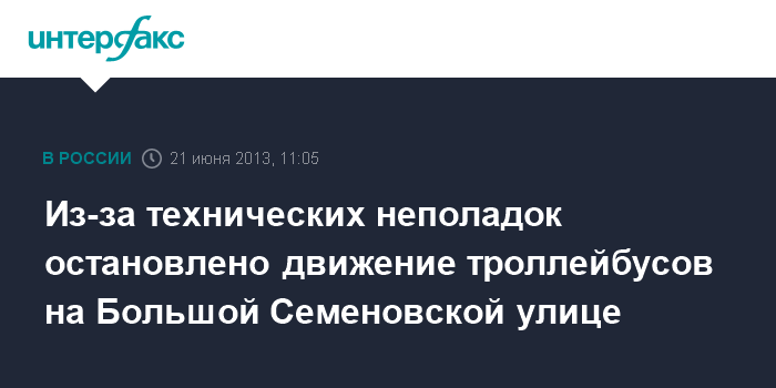 Москва. 21 июня. INTERFAX.RU - Из-за технической неполадки приостановлено движение троллейбусов №№ 25, 45, 32 на улице Большая Семеновская, сообщили в пресс-службе столичного департамента транспорта и развития дорожно-транспортной инфраструктуры