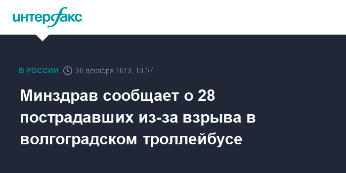 Москва. 30 декабря. INTERFAX.RU - По данным Минздрава, число пострадавших во взрыве троллейбуса в Волгограде увеличилось до 28 человек.