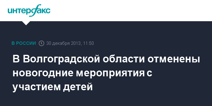 Москва. 30 декабря. INTERFAX.RU - Власти Волгоградской области отменили все новогодние торжества 31 декабря с участием детей, сообщила "Интерфаксу" руководитель пресс-службы губернатора и правительства региона Екатерина Голод.