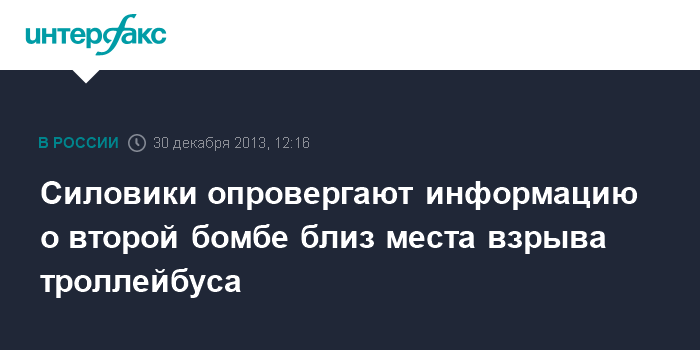 Москва. 30 декабря. INTERFAX.RU - Правоохранители опровергают сообщения СМИ о второй бомбе, обнаруженной недалеко от взорванного в Волгограде троллейбуса.