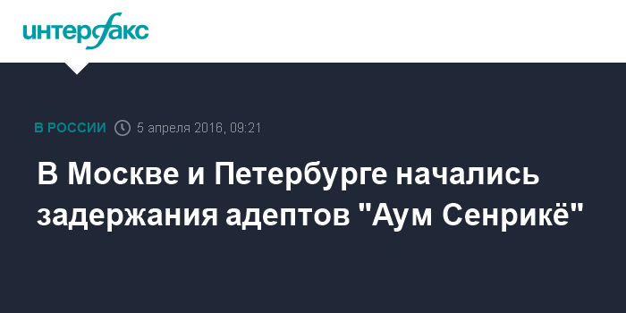 Москва. 5 апреля. INTERFAX.RU - Правоохранительные органы проводят массовые обыски в квартирах в Москве и Санкт-Петребурге, где якобы проживают члены запрещенной в России секты "Аум Сенрикё" (запрещена в РФ), сообщил во вторник телеканал "Россия 24".
