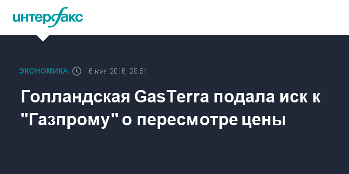 Москва. 16 мая. INTERFAX.RU - Голландская компания GasTerra B.V. 31 марта 2016 г. инициировала арбитражное разбирательство о пересмотре контрактной цены против ООО "Газпром экспорт" в Международном арбитражном суде Международной торговой палаты, сообщил "Газпром".