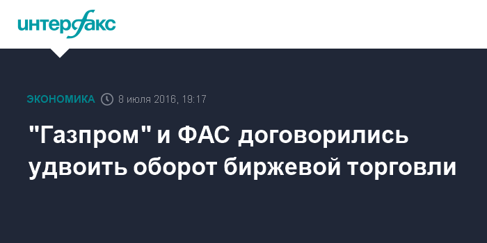 Москва. 8 июля. INTERFAX.RU - "Газпром" и ФАС договорились увеличить обороты биржевой торговли, чтобы в ближайшие месяцы выйти на обороты до трех млрд куб. м в месяц, что соответствует предусмотренному постановлением правительства РФ обороту в 35 млрд куб. м газа в год.