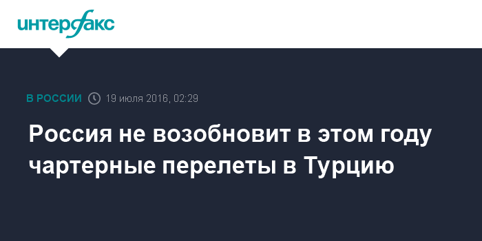 Москва. 19 июля. INTERFAX.RU - Россия и Турция не возобновят в этом году чартерные авиаперевозки, сообщила "Известиям" во вторник исполнительный директор Ассоциация туроператоров России (АТОР) Майя Ломидзе.