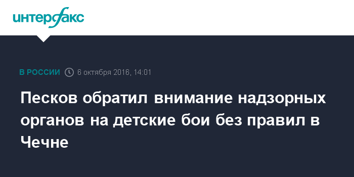 Москва. 6 октября. INTERFAX.RU - Трансляция по телевидению боев без правил среди малолетних детей, в ходе которых один из участников был отправлен в нокаут, является поводом для надзорных органов обратить внимание на этот вопрос, заявил пресс-секретарь президента РФ Дмитрий Песков.