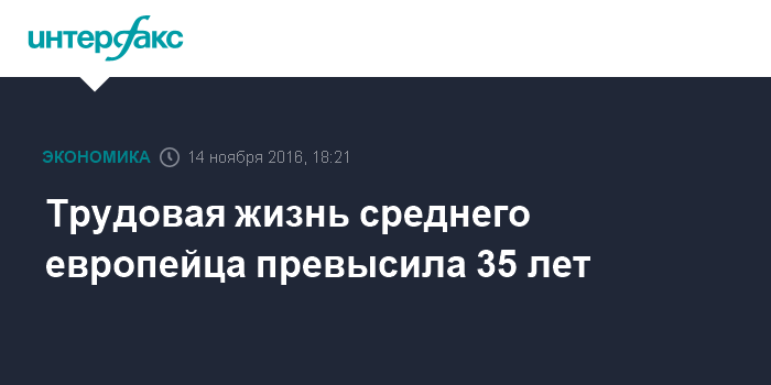 Москва. 14 ноября. INTERFAX.RU - Средний показатель продолжительности трудовой жизни в Европе увеличился и, согласно подсчетам за 2015 год, составляет 35,4 года, свидетельствуют данные статистической службы Европейского союза Eurostat.