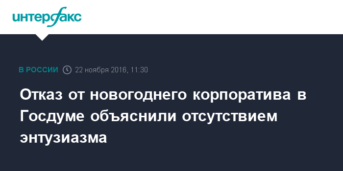 Москва. 22 ноября. INTERFAX.RU - Новогоднего корпоратива в Госдуме не будет, потому что ни одна из фракций не предложила его организовать, сообщили "Интерфаксу" во вторник в нижней палате.