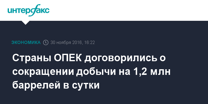Москва. 30 ноября. INTERFAX.RU - Страны ОПЕК достигли соглашения о коллективном сокращении добычи на 1,2 млн баррелей в сутки, до 32,5 млн б/с, сообщает агентство Bloomberg со ссылкой на пожелавшего остаться анонимным делегата.