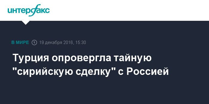 Москва. 19 декабря. INTERFAX.RU - Анкара в понедельник отвергла существование секретной "сделки" с Россией относительно будущего Сирии, сообщают западные СМИ.