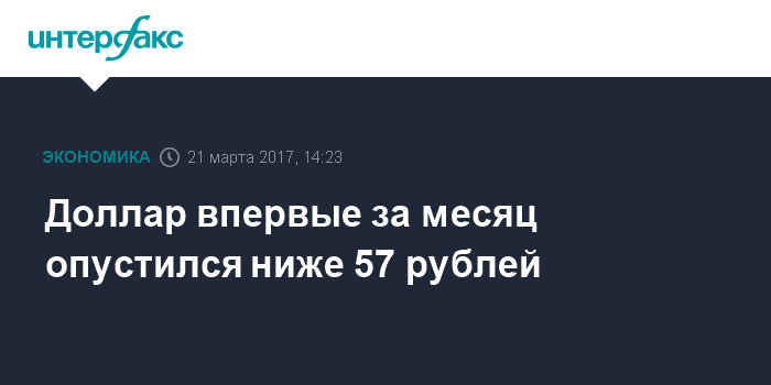 Москва. 21 марта. INTERFAX.RU - Доллар США в ходе торгов на Московской бирже во вторник днем обновил минимум с 16 февраля, опустившись ниже 57 руб./$1 на фоне роста цен на нефть.