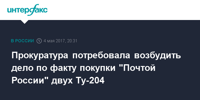 Москва. 4 мая. INTERFAX.RU - Генеральная прокуратура РФ направила в следственные органы для возбуждения уголовного дела материалы проверки законности приобретения "Почтой России" двух самолетов Ту-204, подтвердил "Интерфаксу" официальный представитель надзорного ведомства Александр Куренной. Ранее об этом сообщила газета "Коммерсантъ".