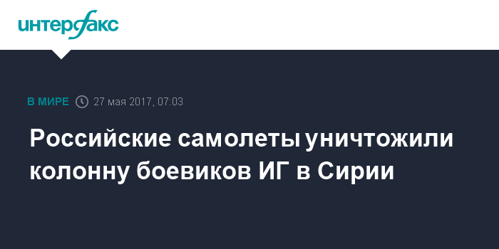 Москва. 27 мая. INTERFAX.RU - Российская боевая авиация в Сирии уничтожила более 120 боевиков террористической группировки ИГИЛ (запрещена в РФ), которые пытались прорваться из Ракки в район Пальмиры, сообщил в субботу источник в министерстве обороны РФ.
