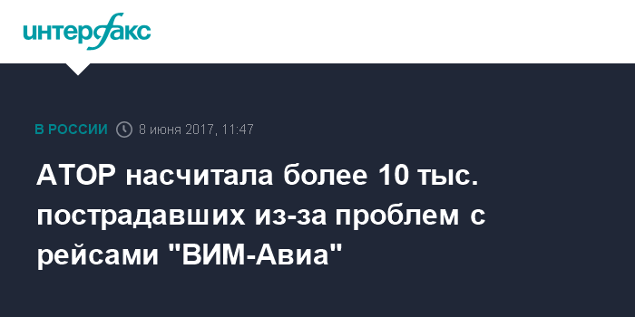 Москва. 8 июня. INTERFAX.RU - Более 10 тыс. человек пострадали от действий "ВИМ-Авиа", до конца летнего сезона туры с перелетами на базе перевозки авиакомпании забронировали порядка 250 тыс. туристов, сообщила в четверг Ассоциация туроператоров России (АТОР).