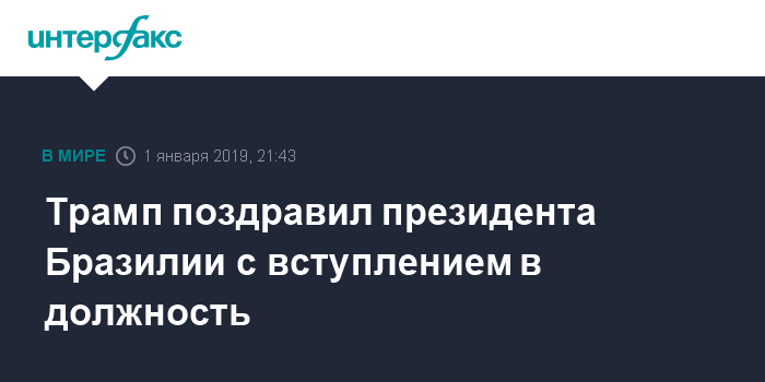 Вашингтон. 1 января. INTERFAX.RU - Президент США Дональд Трамп во вторник поздравил Жаира Болсонару с официальным вступлением на пост президента Бразилии.