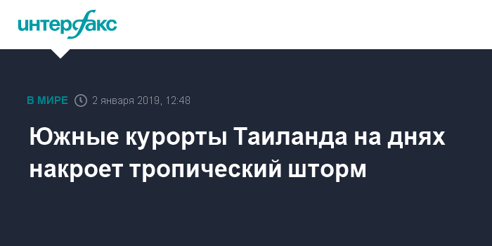 Москва. 2 января. INTERFAX.RU - На туристические районы юга Таиланда, включая Пхукет, Краби и Самуи, надвигается тропический шторм "Пабук", сообщает метеорологический департамент страны.