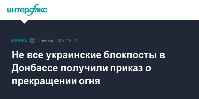 Москва. 2 января. INTERFAX.RU - Офицеры Вооруженных сил Украины, несущие службу на одном из блокпостов в Донецкой области, не получали приказ о прекращении огня на линии соприкосновения в Донбассе, сообщили в среду "Интерфаксу" в пресс-службе Специальной мониторинговой миссии (СММ) ОБСЕ.