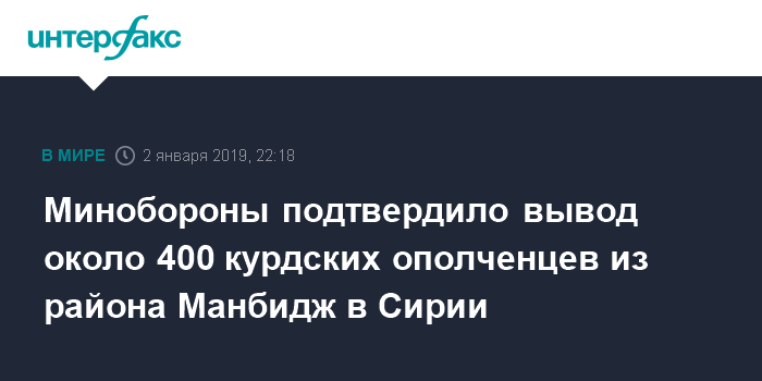 Москва. 2 января. INTERFAX.RU - В рамках ранее достигнутых договоренностей с сирийской стороной по налаживанию мирного процесса на севере Сирийской Арабской Республики с 1 января 2019 года начался отвод курдских отрядов самообороны из района Манбидж.