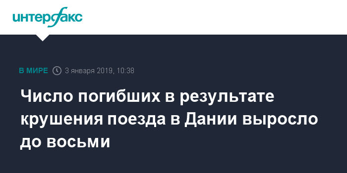 Москва. 3 января. INTERFAX.RU - Число жертв крушения поезда на мосту в Дании возросло до восьми человек, сообщает телеканал Sky News.