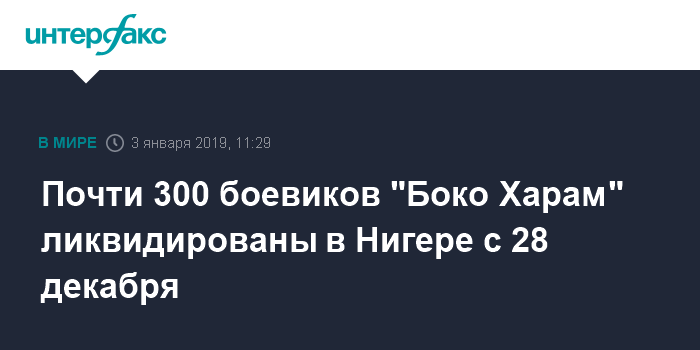 Москва. 3 января. INTERFAX.RU - Армия Нигера уничтожила более 280 боевиков террористической группировки "Боко Харам" (запрещена в РФ) в результате наземной операции и авиаударов, начавшихся 28 декабря, сообщают западные СМИ со ссылкой на Минобороны страны.