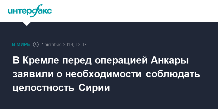 Москва. 7 октября. INTERFAX.RU - В Кремле в связи с планами Анкары провести военную операцию против сирийских курдов рассчитывают, что Турция во всех ситуациях будет соблюдать территориальную и политическую целостность Сирии.