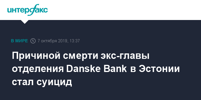 Москва. 7 октября. INTERFAX.RU - Смерть бывшего руководителя эстонского отделения датского банка Danske Bank Айвара Рехе произошла в результате самоубийства, заявил в понедельник СМИ министр внутренних дел Март Хельме.