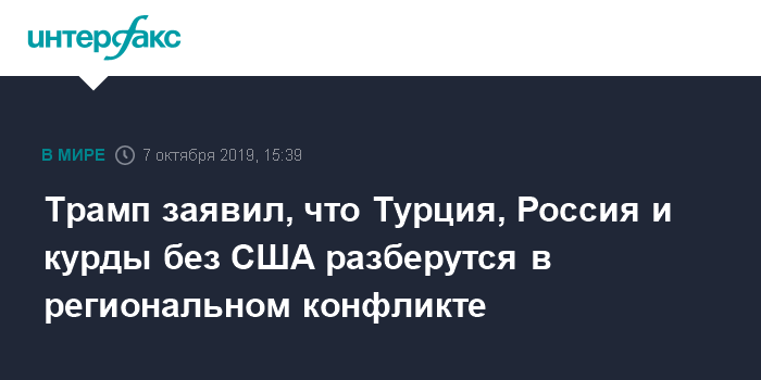 Москва. 7 октября. INTERFAX.RU - Президент США Дональд Трамп в понедельник обосновал свое решение не вмешиваться в конфликт Турции и курдов и заявил, что региональные силы, включая Россию, сами решат проблемы, в том числе вопрос пленных боевиков группировки "Исламское государство" (ИГ, запрещена в РФ).