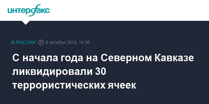 Москва. 8 октября. INTERFAX.RU - С начала года на территории Северо-Кавказского федерального округа (СКФО) было ликвидировано 30 террористических ячеек, члены которых готовили преступления в местах массового пребывания людей, сообщил председатель Национального антитеррористического комитета (НАК), директор ФСБ России Александр Бортников.