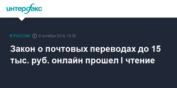 Закон о почтовых переводах до 15 тыс. руб. онлайн прошел I чтение