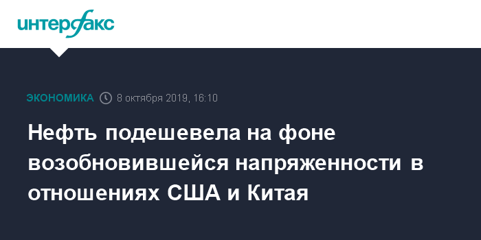 Москва. 8 октября. INTERFAX.RU - Нефтяные цены в ходе торгов во вторник развернулись вниз, утратив завоеванные ранее позиции, на фоне возобновившейся напряженности в отношениях между США и Китаем, которая омрачает надежды на урегулирование торгового спора.